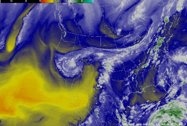 This is an animated loop of water vapor systems over the western area of North America on September 12th, 2013 as shown by the GOES-15 and GOES-13 satellites. The storm that caused the 2013 Colorado flooding was kept in a confined area over the Eastern Range of the Rocky Mountains in Colorado by these water vapor systems.